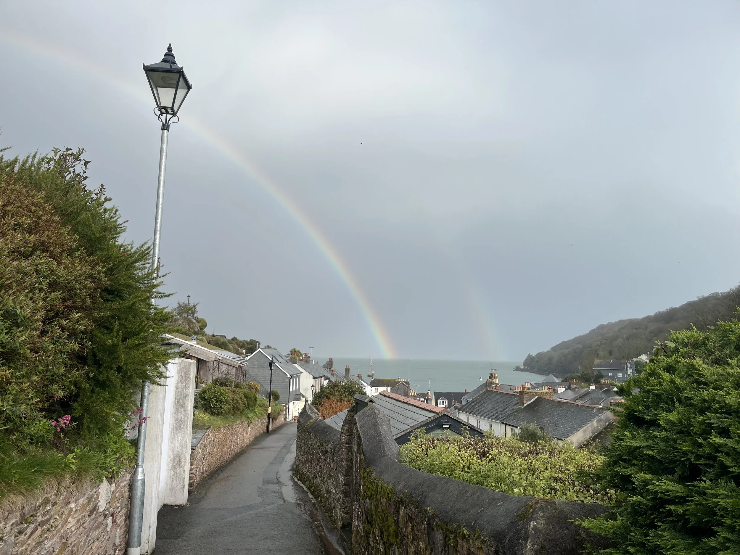 Ed and I were walking in Cawsand, a tiny Cornish seaside village, close to where she lived and where we had spent a lot of time with her. As we walked out along the edge of the sea, there was a small partial rainbow near a lighthouse far out to sea. Ed said, “Oh, look, there’s Mum.” In our shellshocked state, this seemed totally reasonable. I was thinking, “Oh, she’s only small, maybe she’s having a hard time communicating to us. That’s a shame.” Something like that, it was not verbally formed, it was just a general feeling.